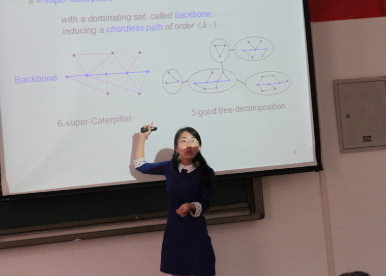 研讨会上,穆学文、张欣、李碧、魏德运、凌博、李金沙、贺慧敏、李本崇、白振国和王亮等十位青年教师分别做了题为《一种基于一类NCP函数的{-1,1}二次规划增广拉格朗日解法》、《图的均匀染色及相关问题》、《k-super-caterpillar tree decomposition and its application in compact routing scheme》、《变换域多通道采样及其在图像缩放中的应用》、《各向同性函数类的最优恢复问题》、《The design of iterative learning control protocols for multi-agent systems》、《几类非线性问题解的迭代逼近》、《VC dimension induced by discrete Markov networks and Bayesian networks》、《Traveling waves in a delayed SIR epidemic model with nonlinear incidence》和《Inference of constant-ssive censoring》的精彩报告。