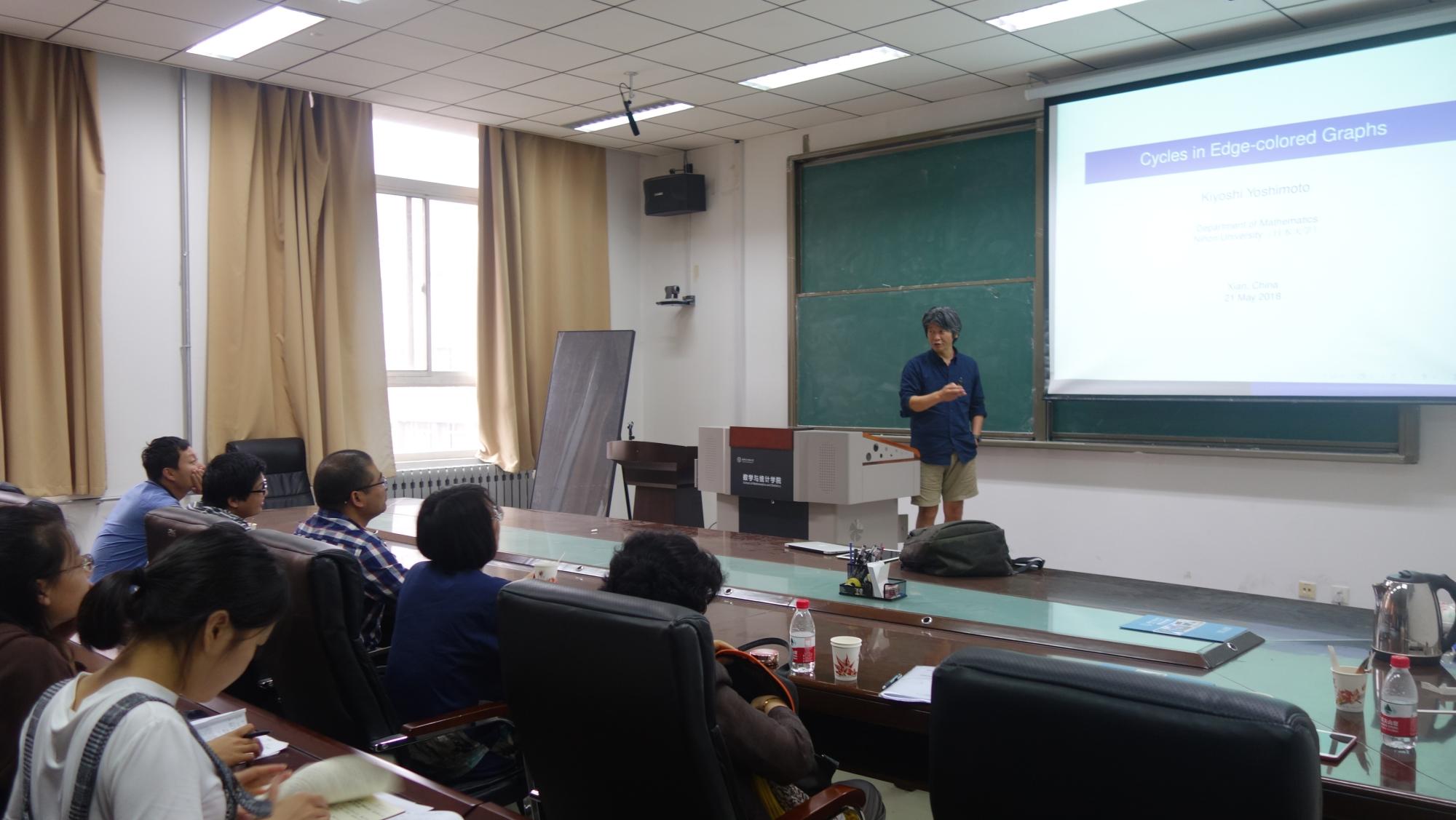 Yoshimoto教授的报告主题是边着色图中的子图存在性问题,包括彩虹子图和正常着色子图两部分内容。他首先介绍了色度条件下彩虹圈问题的研究进展,然后介绍了正常着色子图存在性问题与彩虹子图存在性问题之间的联系,最后详细介绍了他们关于完全二部图中不含正常着色4圈时图结构的刻画定理。