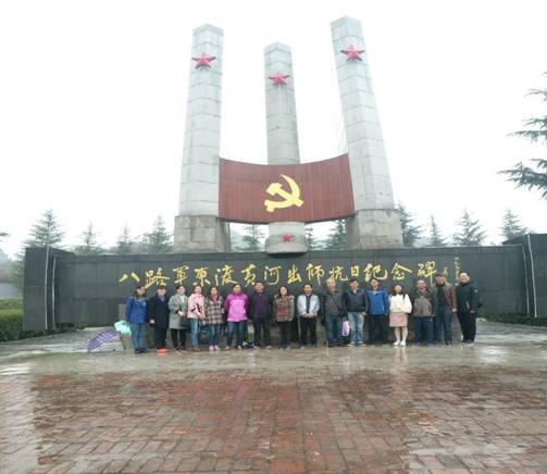 参观完展厅之后,大家一同来到了八路军东渡黄河纪念碑。这座纪念碑建于近傍黄河渡口的凤凰台上,它的上部是由三片高大的竖向风帆组成,象征当年东征的三支主力军,下部由八个船型基座组成,寓意坚不可摧的八路军和艰苦卓越的八年抗战之意。飘动的曲面党旗将三个风帆联结一起,寓意这三支主力部队由党统一指挥。大家在纪念碑前,缅怀爱国将士,并合影留念。