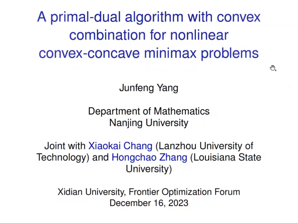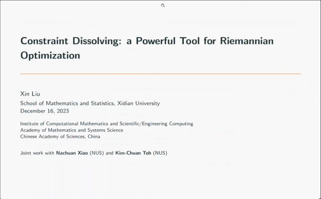 大会开幕式之后,举行了ballbet贝博martini“2023最优化前沿论坛”,论坛分为四节,包括大会邀请报告及自由提问研讨环节。12月16日上午第一节,北京大学文再文教授、中国科公司数学与系统研究院刘歆研究员分别做了题为“An AugmentedLagrangianPrimal-Dual Semismooth Newton method for Multi-Block Composite Optimization”和“Constraint Dissolving Approaches for a Class of Riemannian Optimization Problems”的报告。