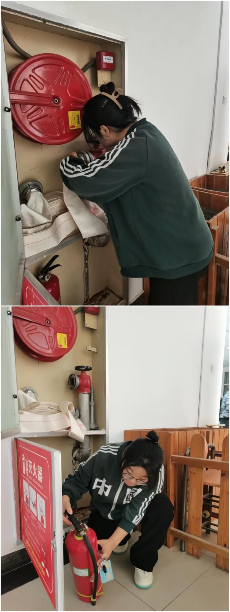 消防安全检查岗的同学们则对宿舍楼内的消防器材和安全设施进行检查。他们认真排查过期、破损及不符合标准的设施,并及时上报楼长,确保安全。冯睿同学表示:“通过这样的实践,不仅增强了我的安全意识,也提高了处理突发事件的能力,也更加深刻地认识到消防工作的责任感与使命感。”