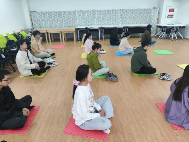 活动特别设置了正念冥想环节,在老师的温柔引导下,同学们闭目深呼吸,让忙碌的心灵暂时停下脚步。“闭眼深呼吸时,像给乱糟糟的脑子按下暂停键,几分钟后再睁眼,会觉得周围的声音都轻了点。” 一位同学如此描述自己的体验。