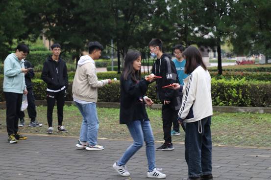 随后,同学们一路前往行政楼,等候他们的,是难度系数最高的接运乒乓球。一点点风,一个倾斜,甚至用力不当都可能导致任务的失败。虽然还是秋天,但却已经寒风刺骨,宛如跨过了这个季节,直接奔入了凛冬。在风力的影响之下,同学们的任务变得难度重重,但还是有精心准备的同学顺利完成了任务。部分同学不断经历失败,同学们为他们参赛人员喝彩助威,点燃着校园的热情,虽然任务失败了,但热情已经代替了冰冷。