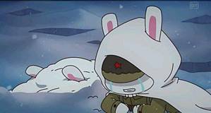 『正值隆冬大雪,兔子们隐蔽在雪堆里瑟瑟发抖,而此时对面的鹰酱正因不吃罐头想要烤肉而大发脾气。兔子A不知不觉流下了口水,旁边的兔子B推了推兔子A:“不要流口水,口水会冻住的。”“嗯。亲,你的眼泪冻住了。”“不要在意那些细节,距离发起攻击还有多长时间?”