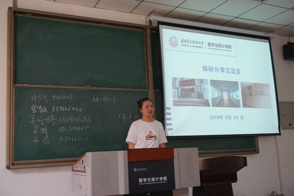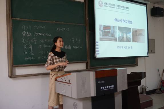 分享会主要以座谈会的形式开展,由2015级已经保送研究生的同学依次分享自己的保研经历及体会。在分享过程中,几位同学对夏令营材料、笔试、面试的准备以如何联系导师进行了详细的解读,重点指出,做好个人的简历,要认真复习数学分析、高等代数和概率论课程,同时重视面试环节,准备好英文的自我介绍。几位同学也列举了面试中经常会提问的一些问题,例如:哪门课学的好、数学建模中用到了哪些统计学知识、牛顿法如果陷入局部最优解怎么办等等。几位同学在分享的过程中着重提到,在申请推免的过程中,要有明确的目标,充分的准备,梳理自己的大学经历并凝练总结,同时要保持积极向上的心态,遇见挫折不要轻言放弃,端正心态,坚持不懈。