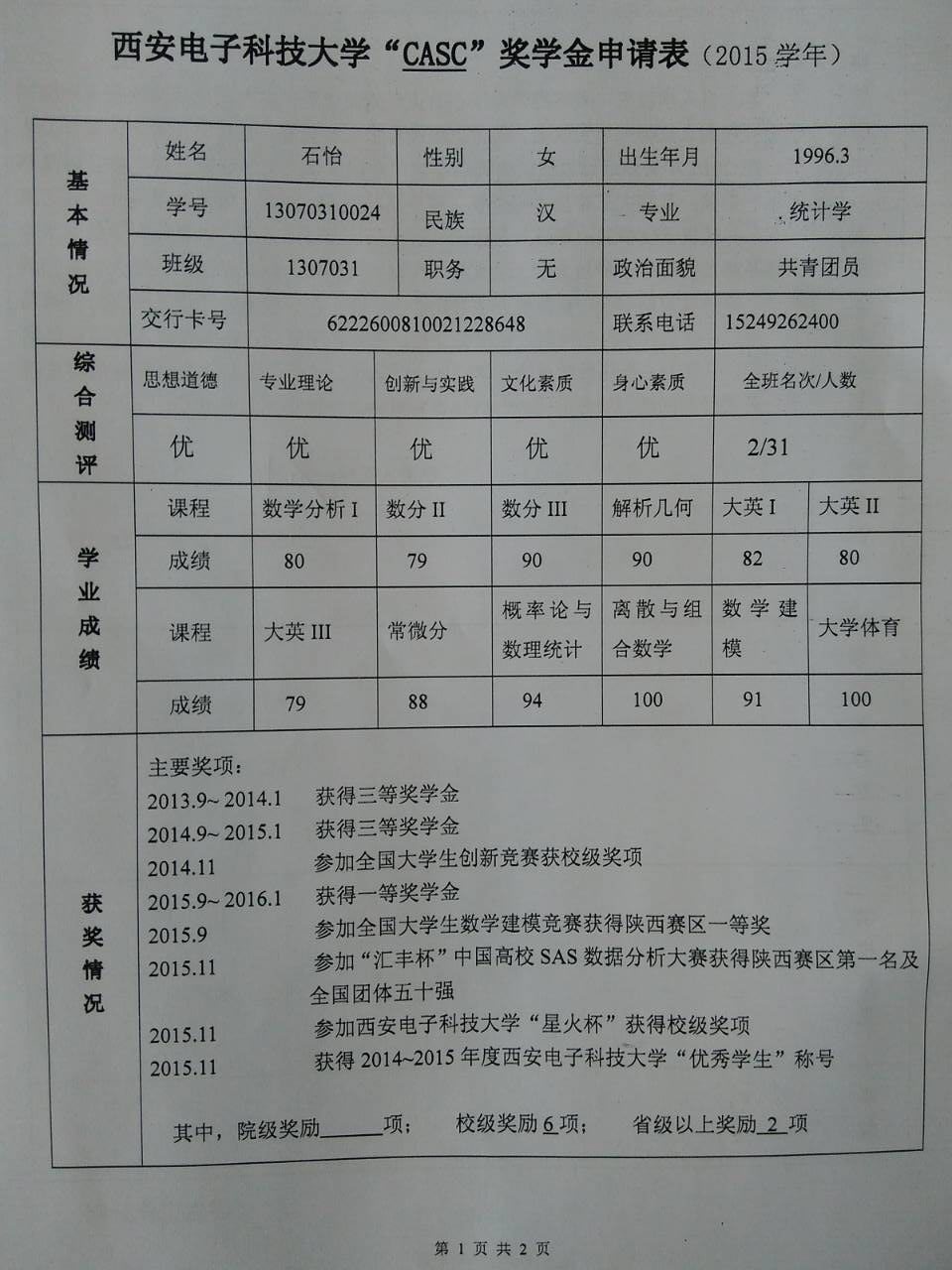 经过前期个人申请及评选,公司拟推荐石怡同学作为”CASC“社会奖学金(三等)候选人,现在全院公示。